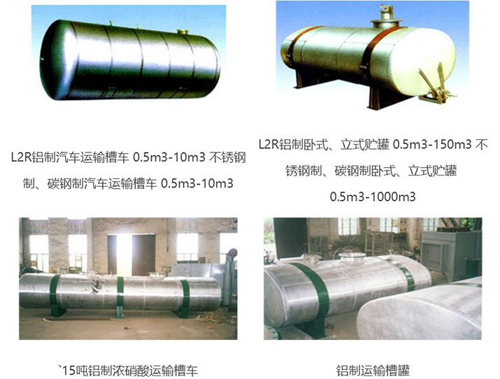 工業(yè)純鋁板制汽車(chē)運(yùn)輸槽車(chē)、臥式、立式貯罐、高位槽。(主要用于貯運(yùn) 濃硝酸、冰醋酸等腐蝕液體)不銹鋼、碳鋼制各種汽車(chē)運(yùn)輸槽車(chē),臥式、 立式貯槽,高位槽計(jì)量槽。特殊規(guī)格可按用戶(hù)需求設(shè)計(jì)、制造。